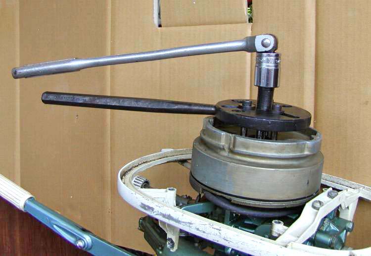 This image shows the proper type of flywheel puller you need to remove the flywheel. This can be rented form your local tool rental as a "steering wheel" puller. DO NOT try to use any kind of puller on the outer diameter of the flywheel as it will bend and destroy it.